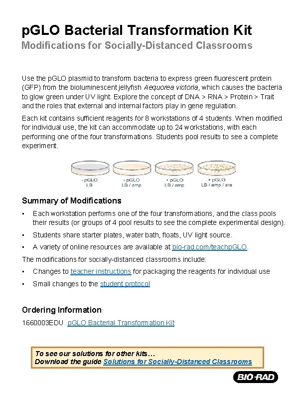 Transitioned from the ap biology lab manual (2001). Student manual pglo transformation lesson 1 introduction to transformation in this lab you will perform a procedure known as a genetic transformation. Students transform e.coli bacteria with a gene that codes for green fluorescent pigment and see . The complete instruction manual for the bacterial transformation: Includes complete introduction, methods, results, and discussion sections with a picture .